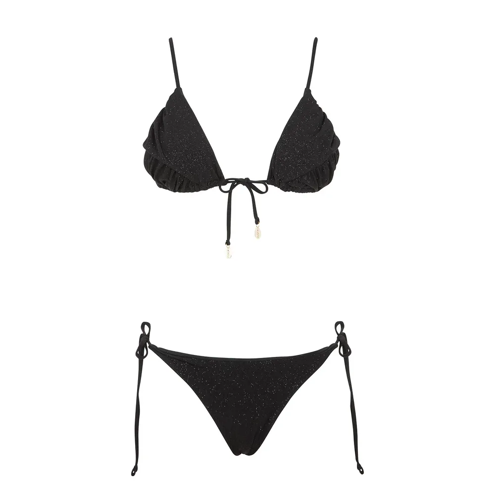 Bikini della linea ‘Cosmos’ modello caratterizzato dal tessuto in microfibra glitterato. La parte top è caratterizzata da coppe removibili, tessuto con arricciatura al centro che dona movimento e praticità, spalline sottili e regolabili, annodabile sul retro o sul davanti a seconda del proprio stile. Lo slip è sgambato con lacci regolabili sui fianchi.