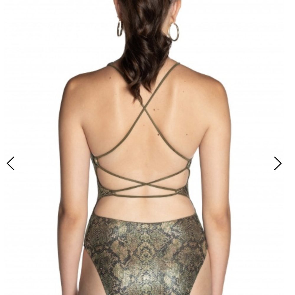 Costume da bagno intero con imbottitua estraibile in stampa Anaconda su tessuto lycra tramato oro per non passare inosservate. I lacci si intrecciano sulla schiena creano incroci seducenti. Profonda scollatura con accessorio a ferro di cavallo in argento invecchiato nel centro seno. Abbinabile alla gonna corta o al pantalone della stessa serie per un effetto full snake skin.