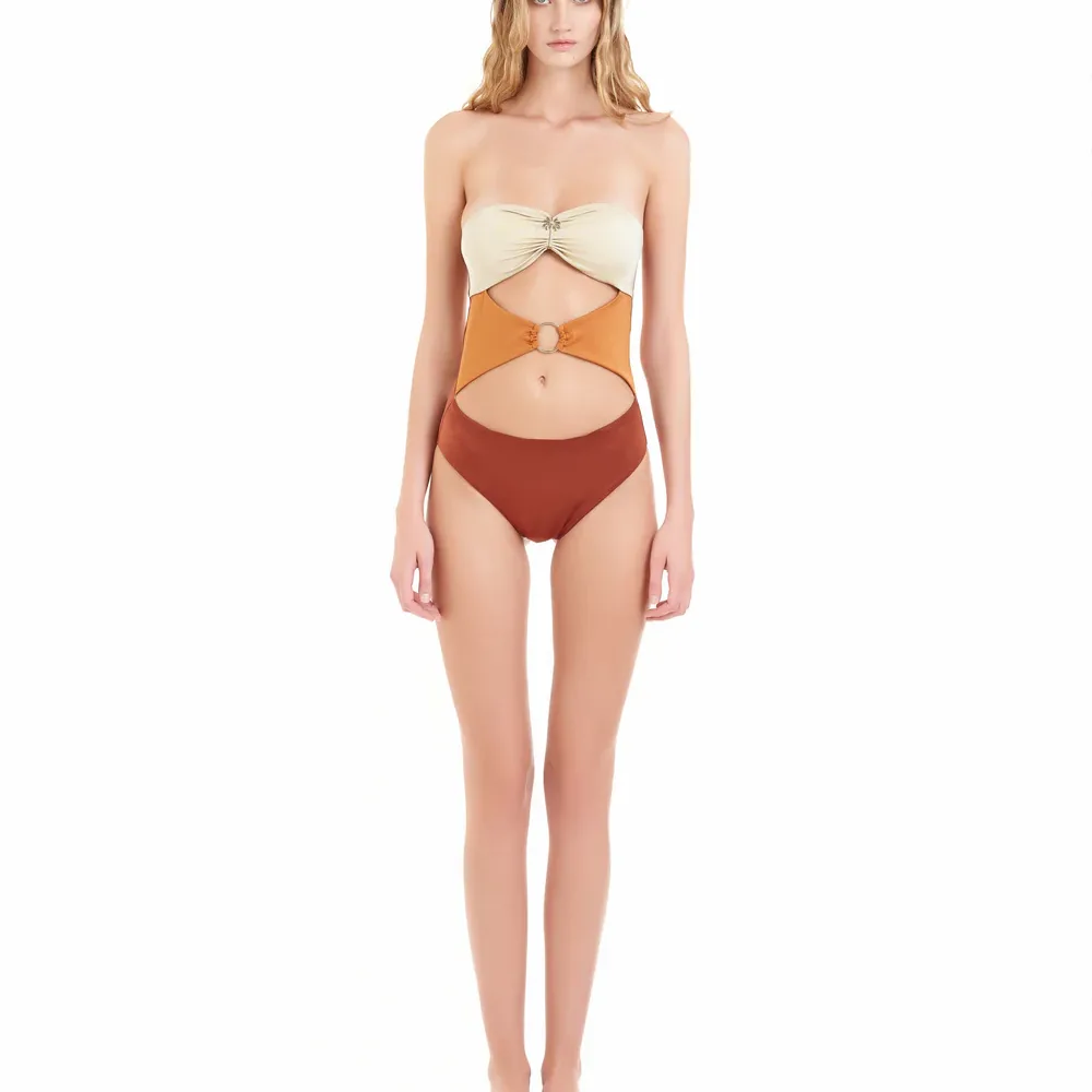 Esalta il tuo stile con il costume intero della linea “Degradè”, un modello audace e sofisticato che unisce design moderno e dettagli unici. Questo costume presenta due aperture cut-out, una sul ventre e l’altra sotto il seno, per un look sensuale e stiloso che valorizza la tua silhouette. L’oblò centrale aggiunge un ulteriore tocco di originalità, mentre il raffinato dettaglio di una palma in metallo al centro della parte superiore conferisce un’ulteriore nota di eleganza e distintività.