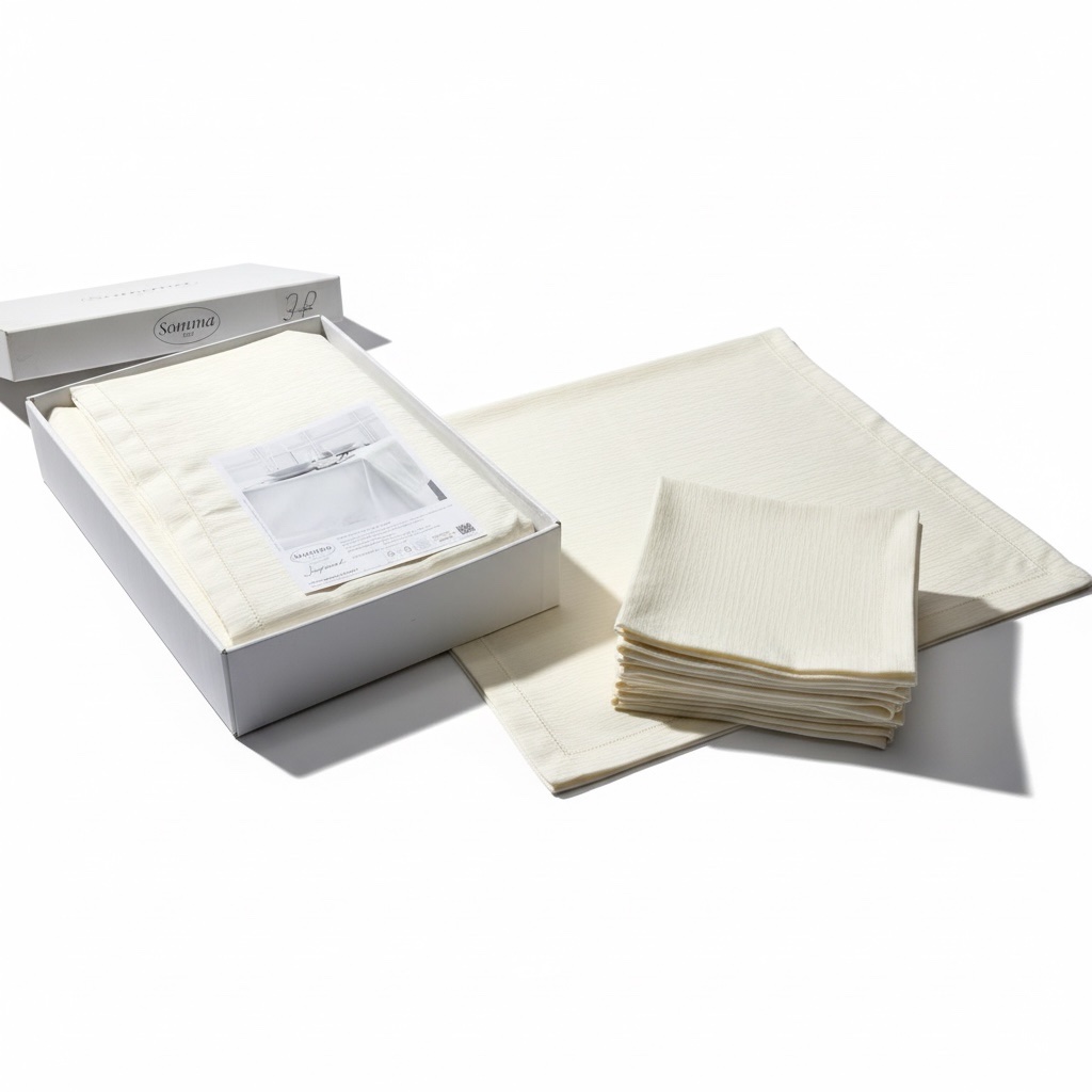 Tovaglia Somma modello Tea 12 posti + 12 tovaglioli, in cotone rettangolare cm 160×270, colore Avena