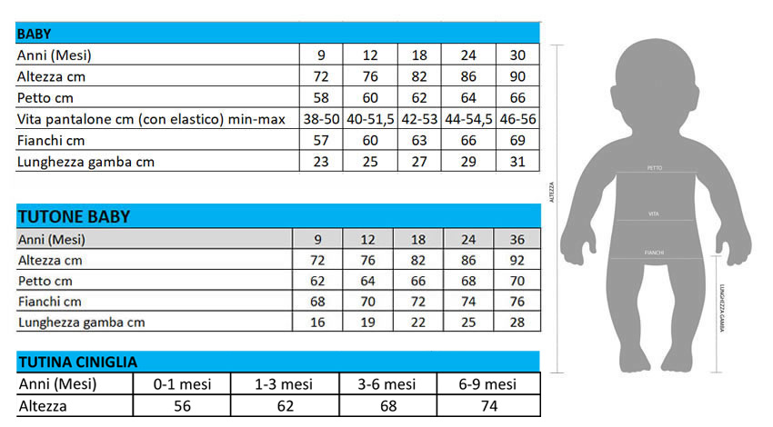 | Taglia | 0-1 mesi, 1-3 mesi, 3-6 mesi, 6-9 mesi |